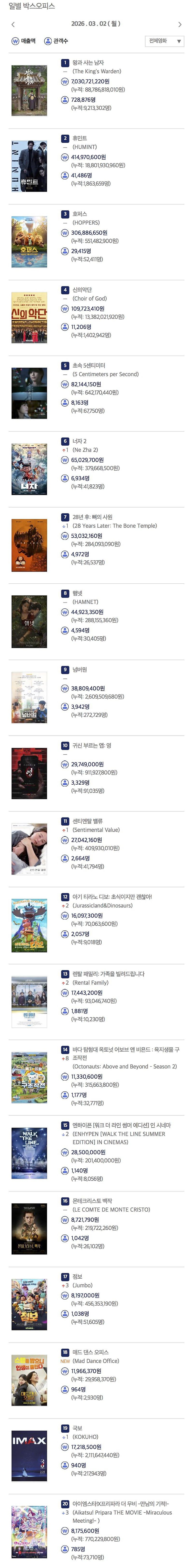 최근 천만 영화들과 왕사남 추이 비교 작성자 정보 슬롯공유소 작성 작성일 2026.03.03 15:21 컨텐츠 정보 3 조회 목록 본문 2월 28일 토요일 : 655,261명3월 1일 일요일 : 816,668명3월 2일 월요일 : 728,876명왕사남이 어제 비가오는 궂은 날씨속에서도 72만명이 관람하며 3월 1일과 2일 이틀동안 154만명을 동원, 누적관객 921만명을 돌파보수적으로 잡아도 이번주 주중에 천만 돌파 확실 SNS 공유 관련자료 댓글 0 등록된 댓글이 없습니다. 로그인한 회원만 댓글 등록이 가능합니다. 목록
