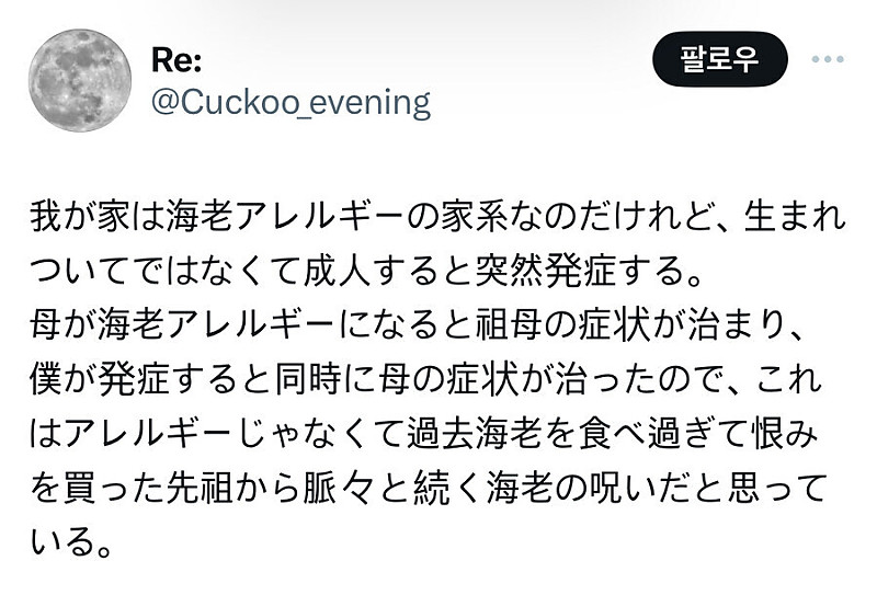 그래서 나는 조상님들이 새우를 너무 많이 잡아먹어서 생긴 저주라고 믿고 있다.