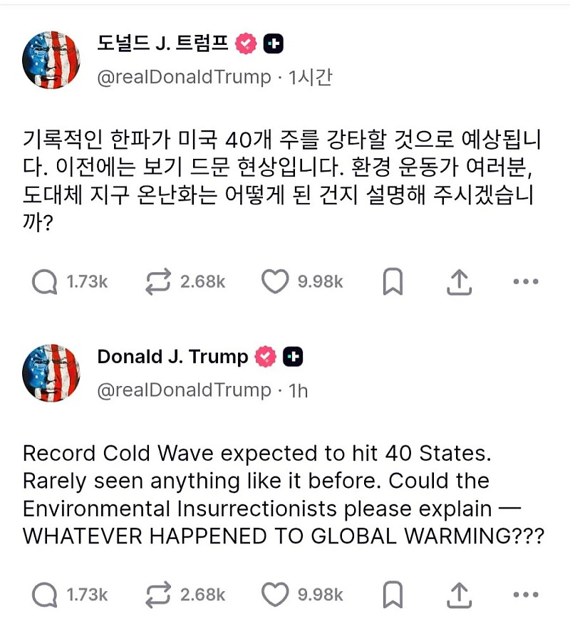트럼프 "진짜 추운데 이게 어떻게 지구 온난화란거야?" 작성자 정보 슬롯공유소 작성 작성일 2026.01.25 19:27 컨텐츠 정보 83 조회 목록 본문 https://truthsocial.com/@realDonaldTrump/115944376084632033알고서도 저러는건가 아니면 진짜 몰라서 저러는건가.. SNS 공유 관련자료 댓글 0 등록된 댓글이 없습니다. 로그인한 회원만 댓글 등록이 가능합니다. 목록