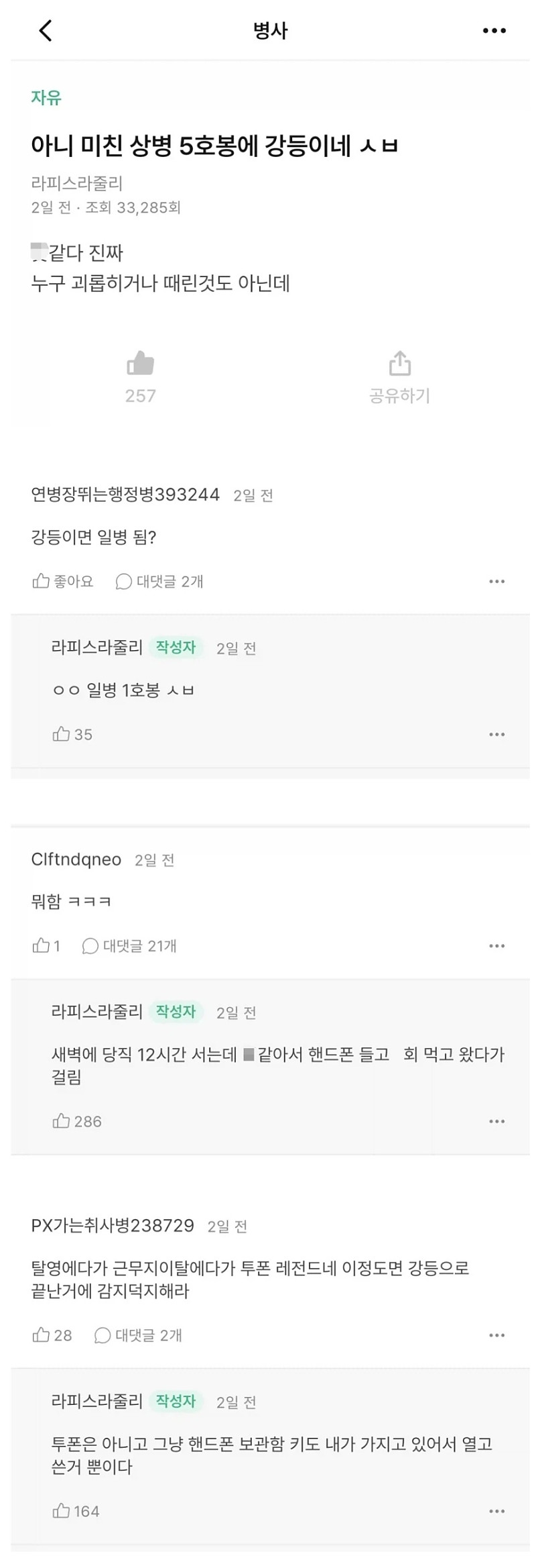 영창이 사라진 요즘 군대 작성자 정보 슬롯공유소 작성 작성일 2026.02.08 13:06 컨텐츠 정보 23 조회 목록 본문 2026년 병 월급병장 1,500,000상병 1,200,000일병 900,000이병 750,000병 기본급이 상승한만큼 계급 강등, 감봉, 견책 조치가 기존보다 훠얼씬 징계 강도가 쎄져서 그깟 영창 따위가 됨.큰 징계 받으면 못해도 1~200만원 이상이 날아간다고... SNS 공유 관련자료 댓글 0 등록된 댓글이 없습니다. 로그인한 회원만 댓글 등록이 가능합니다. 목록