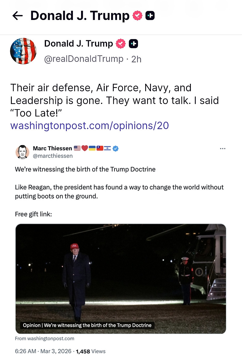 "그들의 방공망, 공군, 해군, 그리고 지도부는 사라졌습니다. 그들은 대화를 원하고 있습니다. 나는 '너무 늦었다!'라고 말했습니다."